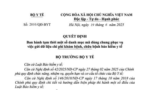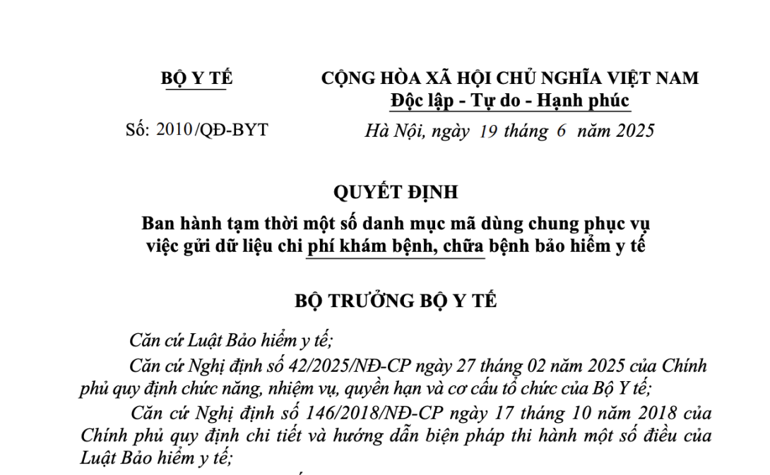 Quyết định 2010/QĐ-BYT năm 2025 ban hành tạm thời danh mục mã dùng chung phục vụ việc gửi dữ liệu chi phí khám bệnh, chữa bệnh bảo hiểm y tế do Bộ trưởng Bộ Y tế ban hành